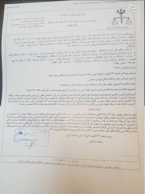 به گزارش مشرق؛ شعبه ۲۹ دیوان عدالت اداری دستور موقت توقف اجرای مصوبه کمیسیون تنظیم مقررات وزارت ارتباطات را به نفع اپراتور رایتل صادر کرد.