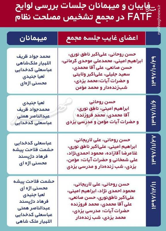 در جدول پیش رو، اسامی اعضا غایب و میهمانان مجمع تشخیص در زمان بررسی لایحه الحاق ایران به کنوانسیون مبارزه با جرایم سازمان یافته فراملی (پالرمو) آمده است: